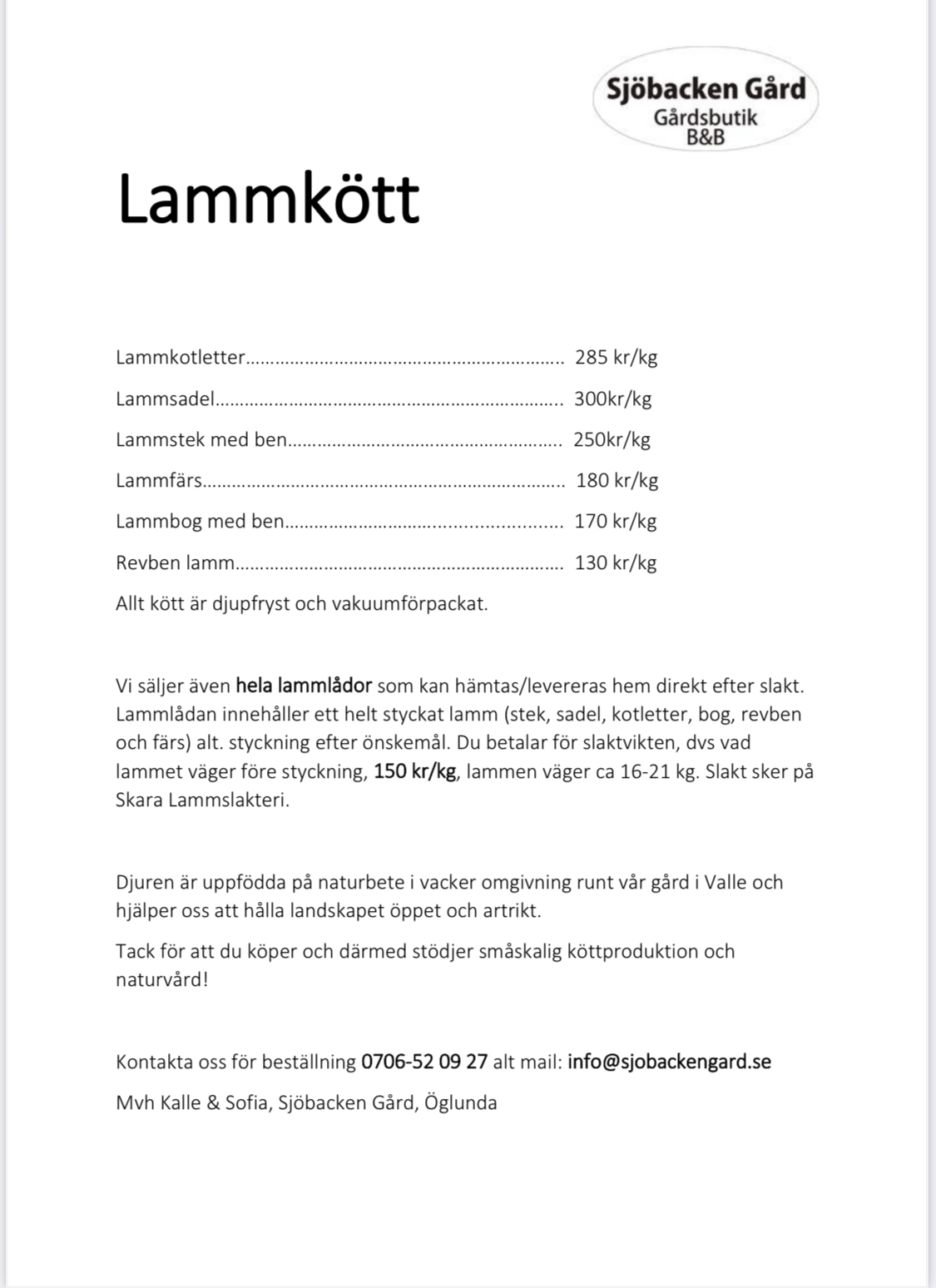 Vi säljer hela lammlådor som kan hämtas/levereras hem direkt efter slakt. Lammlådan innehåller ett helt styckat lamm (stek, sadel, kotletter, sadel, bog, revben och färs) alt. styckning efter önskemål. Du betalar för slaktvikten, dvs vad lammet väger före styckning, 150 kr/kg, lammen väger ca 16-21 kg. Slakt sker på Skara Lammslakteri v.41.